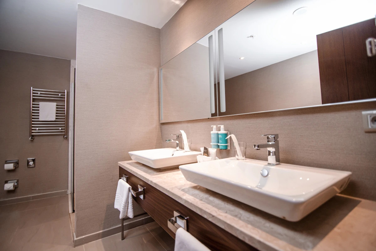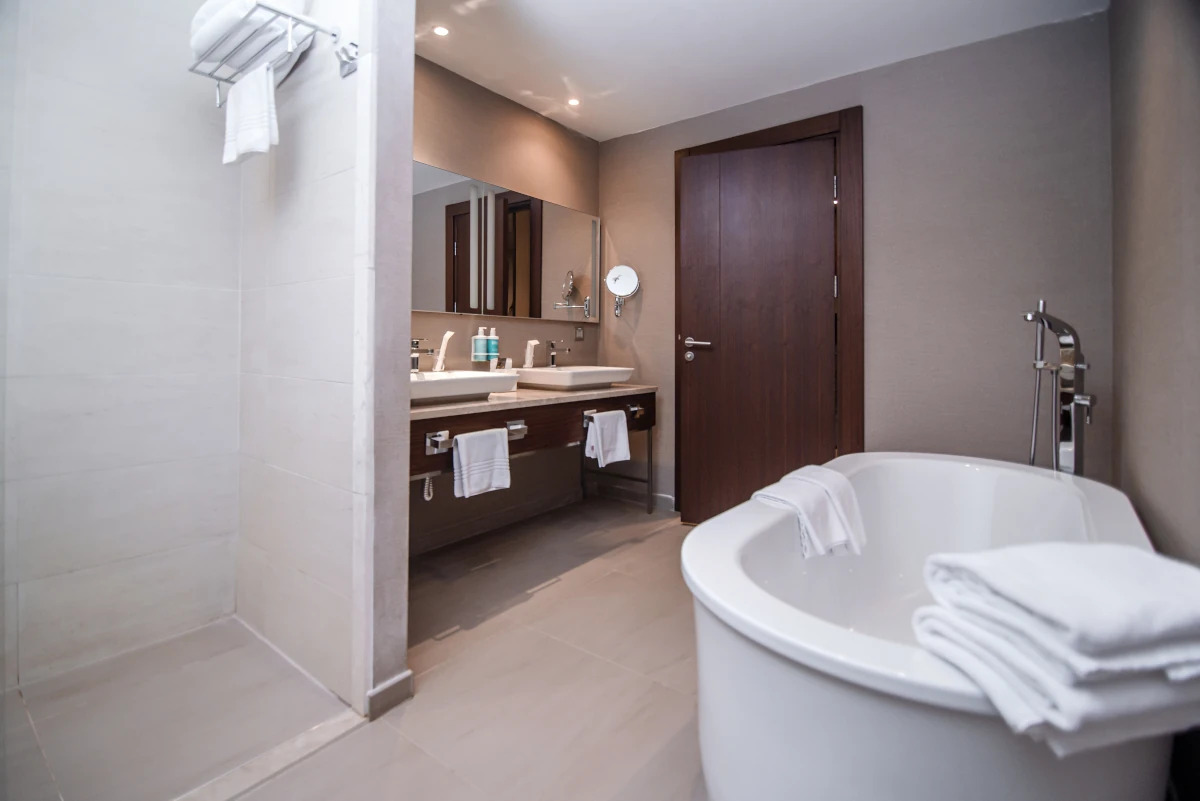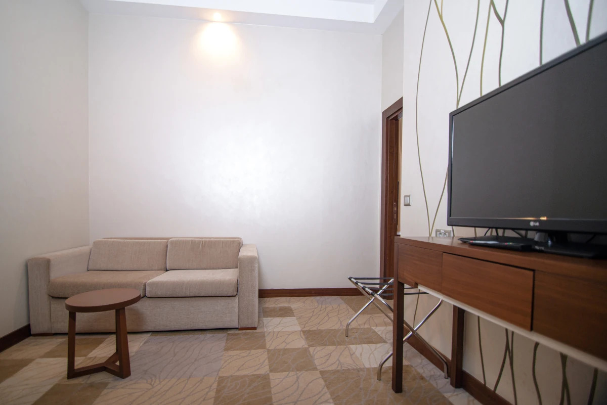 Просторный номер с отдельной спальней и небольшой гостиной зоной, оснащённой мягкой мебелью. В этой зоне можно разместить дополнительное спальное место.