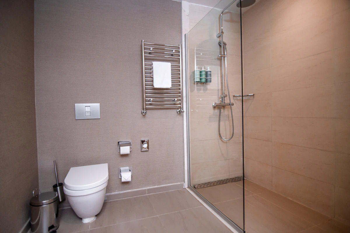 Санузел: с ванной/душем, тапочки, туалетные принадлежности, фен, халат.